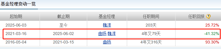 但两位老将合作4年后的任职回报却是亏损超过41%,从2025年6月份后,曲扬离任,该基金由魏淳单独管理,尽管随后基金收益率上涨,但目前仍然没有扭转年内下跌的窘况。
