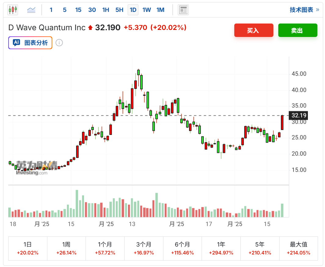 目前,D-Wave(QBTS)股价报 32.19 美元,低于 35 美元的目标底价,而分析师给出的平均目标价则高达 39.64 美元。