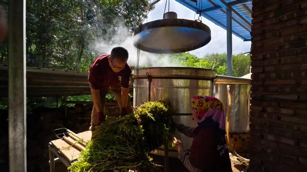 勐腊县来伞伞都合作社社员在粗提炼跳蚤草植物精油。新华社发(赶四 摄)