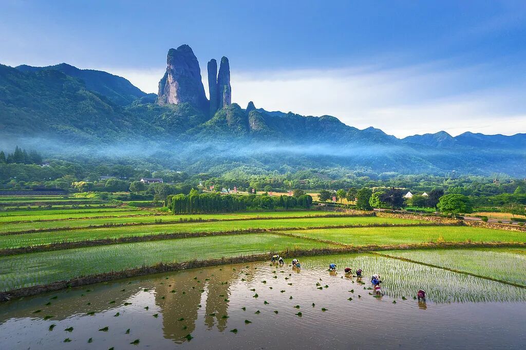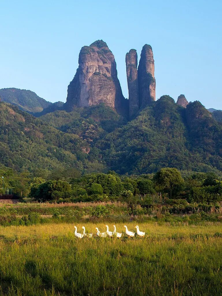 衢州的山,是江郎山那样的硬骨。三块如刀劈的巨石并立,被称作“江南第一奇山”。它不是温柔的绿丘,而是直直插入云海的岩柱,那种“天地裂缝般的力量”,在浙江极少看到。徐霞客称其“摩云插天,势欲飞动”,在这里,山是被仰视的存在。它让人谦卑,也让人沉静。