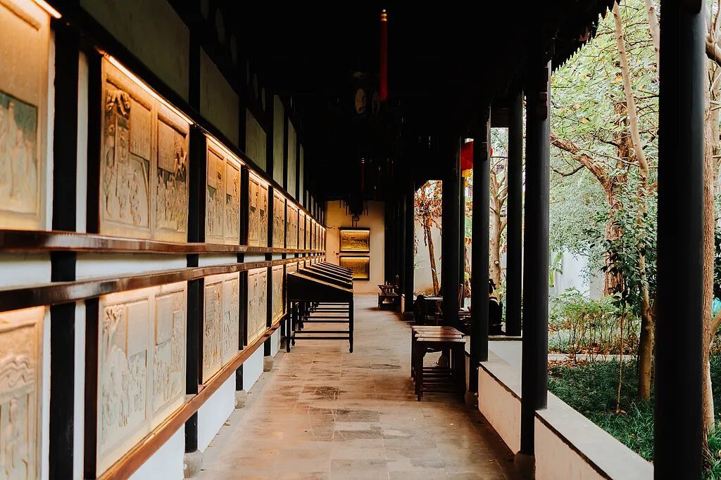 沿着檐下回廊继续向西,我走进孔子圣迹碑廊。整整七十块青石碑镶嵌在白墙之上,刻着《孔子圣迹图》,描绘他自鲁国出行、讲学、授徒的每一幕。镂空的石头上刻着红色的“仁”字,让每一个走进花园的人,放下急躁,回归恬静。在这里,儒家思想已经渗透进了每一处花草树木。