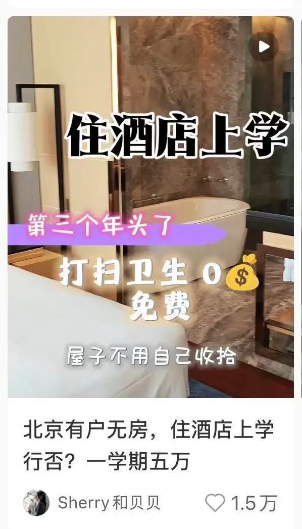 故事本身并不复杂。单亲妈妈Sherry有北京户口,但在市区没有房子。孩子到了入学年龄,为了就近进入东城区的公立学校,她必须在学校周边找到一个稳定的落脚点。摆在眼前的选项,其实也都是北京家长耳熟能详的那几种:要么在西城、东城买一套动辄两千万元起步的老旧学区房,要么租房应付几年,但随时面临房东涨价、收房甚至学位不确定的风险。她最终选择了第三种,住酒店。