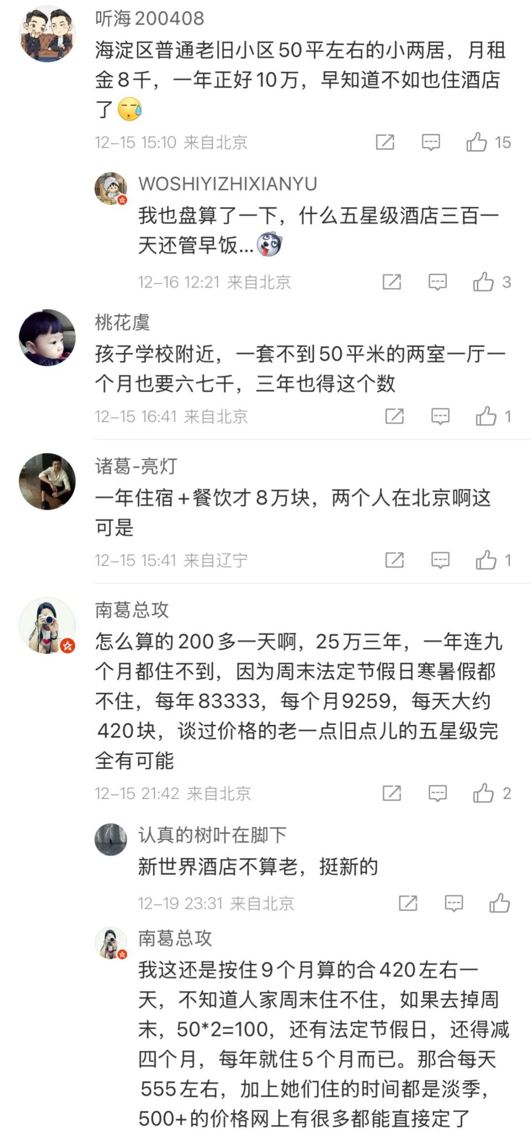 类似的声音在评论区也出现了不少。一位住在海淀老小区的家长算了一笔账:50平方米的小两居,月租金八千元,一年十万元,水电网、早餐、保洁一项项加起来,并不比酒店便宜;还有人直言,五星级自助早餐哪怕按最低标准算,一个月双人也要近两千元,“摊回房价里,反而更清楚”。