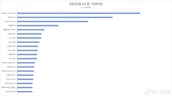 近日,CNMO注意到,数码博主“RD观测”发布了2025年11月中国智能手机市场的单机型销量TOP 20榜单。