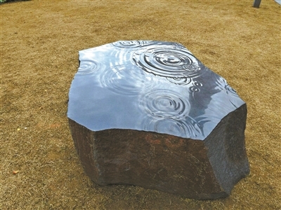 被安放在美术馆草坪上的雕塑《雨》是沈烈毅的系列作品之一。创作者在一块重达三四吨的黑石头表面,展现了水滴溅落湖面所形成的柔和涟漪。石材的阳刚与水的阴柔,恰似竹的劲挺与随风舞动时的摇曳之姿。两种意象形成强烈反差,又相得益彰。手工打磨而成的石面,随着光影的变换和观者走动时的节奏,产生流动之感。