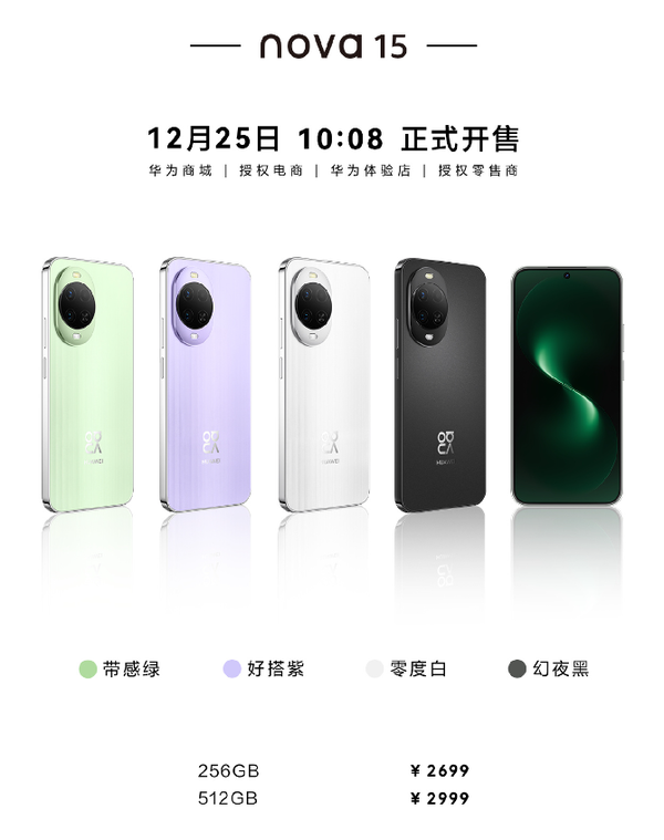 【CNMO科技消息】据华为终端官方消息,华为nova 15系列将在12月25日上午10点08分正式开售,包含华为nova 15、华为nova 15 Pro和华为nova 15 Ultra三款机型,均提供12GB运行内存,存储版本包括256GB和512GB,其中华为nova 15 Ultra额外提供1TB选项。机身配色涵盖带感绿、好搭紫、零度白与幻夜黑四种选择。