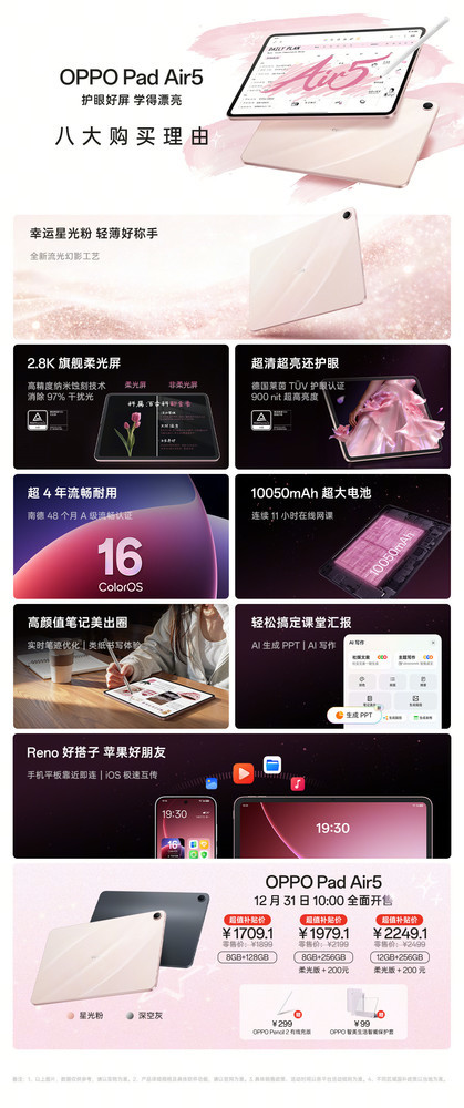 在性能方面,OPPO Pad Air5搭载ColorOS 16系统,官方宣称其具备超4年流畅使用能力,并获得南德48个月A级流畅认证,旨在满足用户从入学到毕业的长期使用需求。OPPO Pad Air5同时内置10050mAh大容量电池,支持连续11小时在线网课播放,续航表现突出。