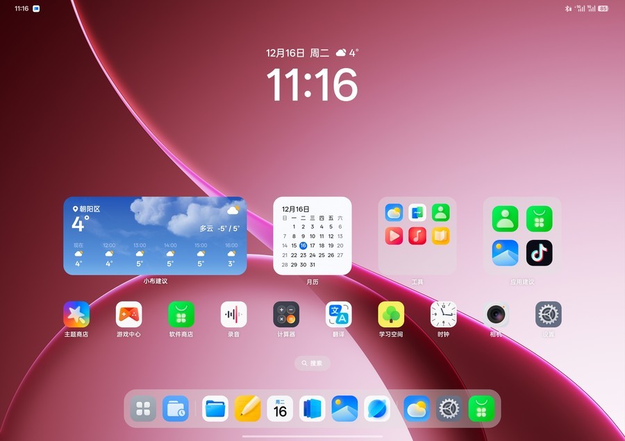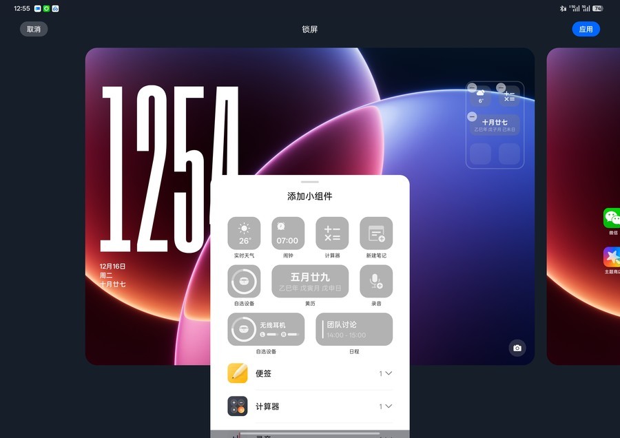 丰富的自定义功能则让平板更具个性化。系统新增大时钟、时钟相框等五套主题模板,支持模板文案自定义;锁屏组件可自由搭配,最多能设置6个常用组件,查看时间、天气、待办事项更便捷。