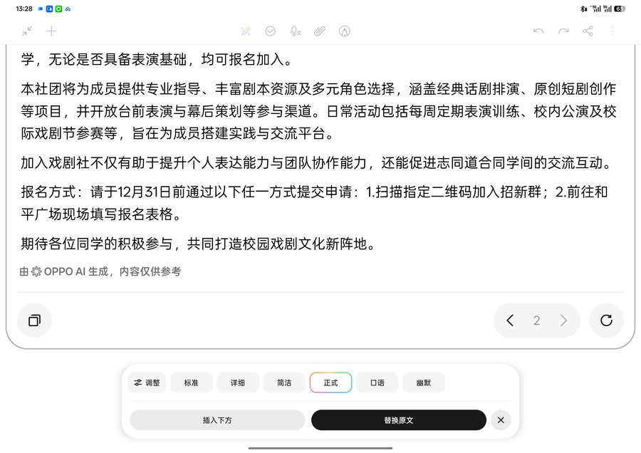 它支持标准、详细、简洁、正式、口语、幽默等多种风格,无论是活泼的招新文案还是正式的汇报稿,都能一键生成,还能进行改写纠错、润色表达。