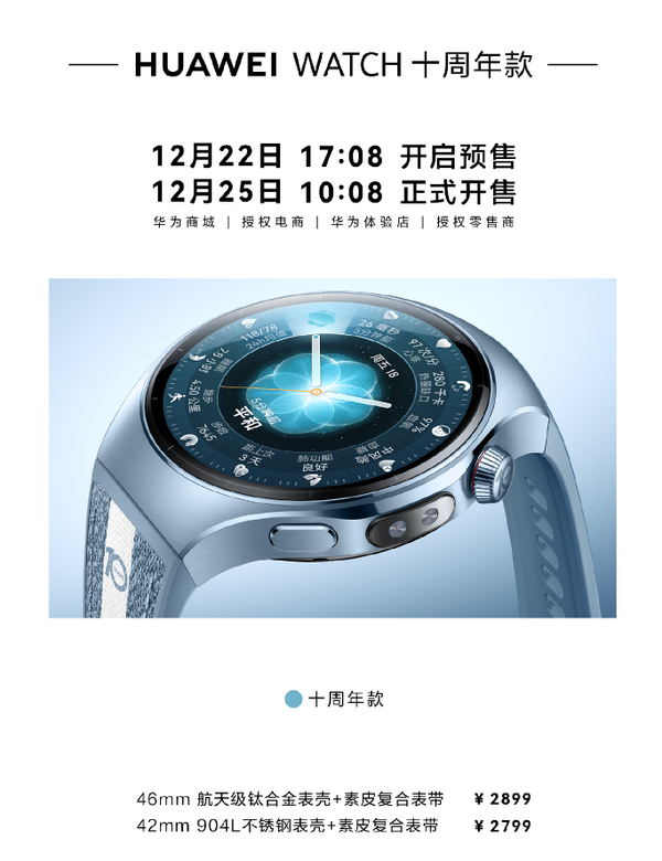 12月25日上午10点08分,华为正式开售HUAWEI WATCH 十周年款智能手表,起售价格为2799元。该产品提供42mm和46mm表盘版本,采用航天级钛合金前壳与陶瓷后壳组合,搭配蓝色素皮复合表带,整机重量约58克(不含表带)。