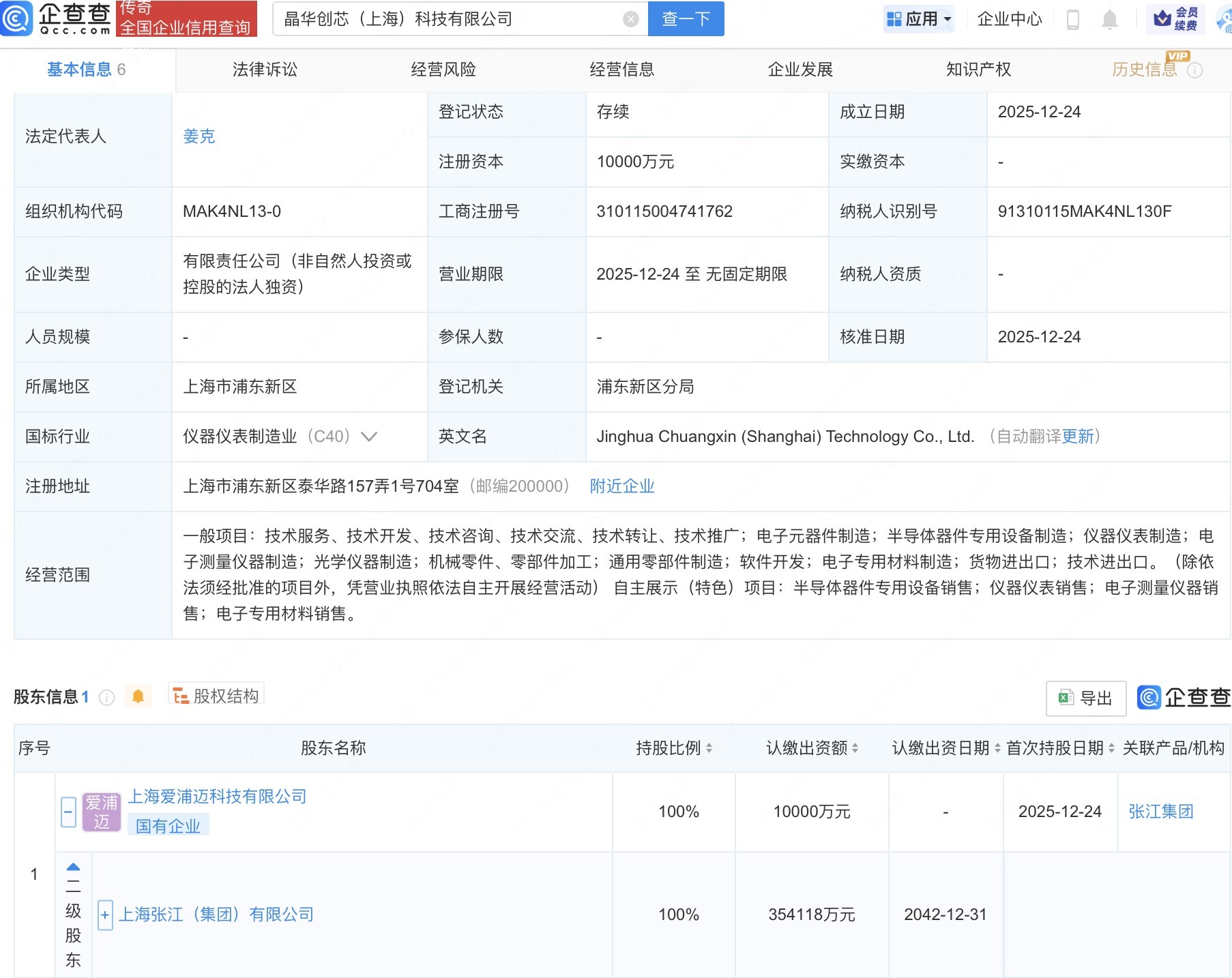 企查查APP显示,近日,晶华创芯(上海)科技有限公司成立,法定代表人为姜克,注册资本1亿人民币,经营范围包括电子元器件制造、半导体器件专用设备制造、仪器仪表制造、电子测量仪器制造等。企查查股权穿透显示,该公司由上海张江(集团)有限公司间接全资持股。