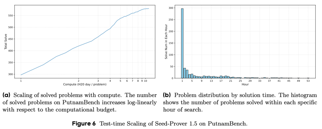 如上图所示,投入更多的计算资源,Seed Prover 1.5对问题的解决率会呈对数线性增长。