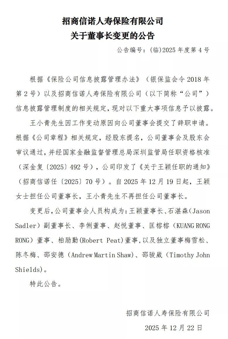 近日,招商信诺人寿发布公告称,王小青因工作变动原因向公司董事会提交了辞职申请。根据《公司章程》相关规定,经股东提名,公司董事会及股东会审议通过,并经国家金融监督管理总局深圳监管局任职资格核准(深金复〔2025〕492号),公司印发了《关于王颖任职的通知》(招商信诺任〔2025〕70号)。自2025年12月19日起,王颖担任公司董事长,王小青不再担任公司董事长。