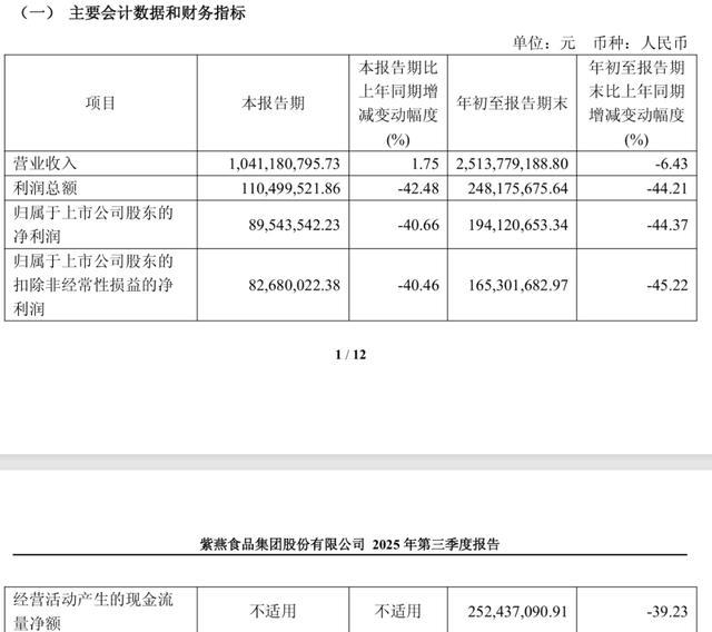 紫燕食品2025年三季报显示,公司前三季营收约25.14亿元,同比减少6.43%;归母净利润约1.94亿元,同比减少44.37%。经营活动产生的现金流净额约2.52亿元,同比减少39.23%。对于公司利润总额同比减少超四成的原因,紫燕食品解释为主要因业绩下滑导致收入降低,毛利下降较多。对于现金流的大幅减少,则是因营收下降,导致销售商品和提供劳务收到的现金有所下降。