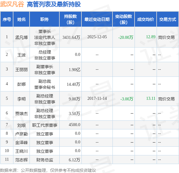 武汉凡谷的高管列表及最新持股情况如下:
