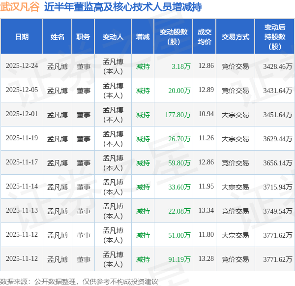证券之星消息,根据12月25日市场公开信息、上市公司公告及交易所披露数据整理,武汉凡谷(002194)最新董监高及相关人员股份变动情况:2025年12月24日公司董事孟凡博共减持公司股份3.18万股,占公司总股本为0.0047%。变动期间公司股价上涨2.39%,12月24日当日收盘报12.86元。