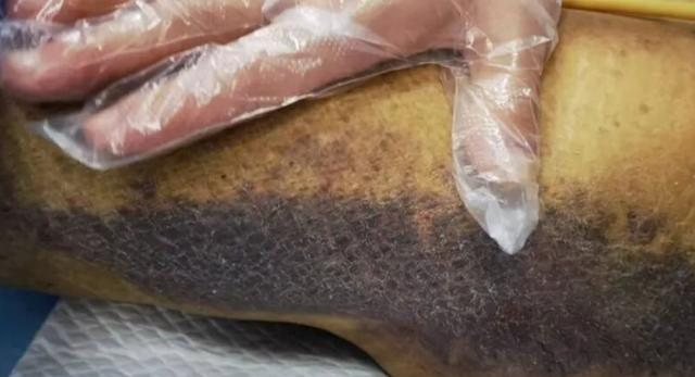 (▲患者骨盆骨折后下肢出现的进行性、广泛性皮下瘀斑,是提示活动性出血的重要体征。)