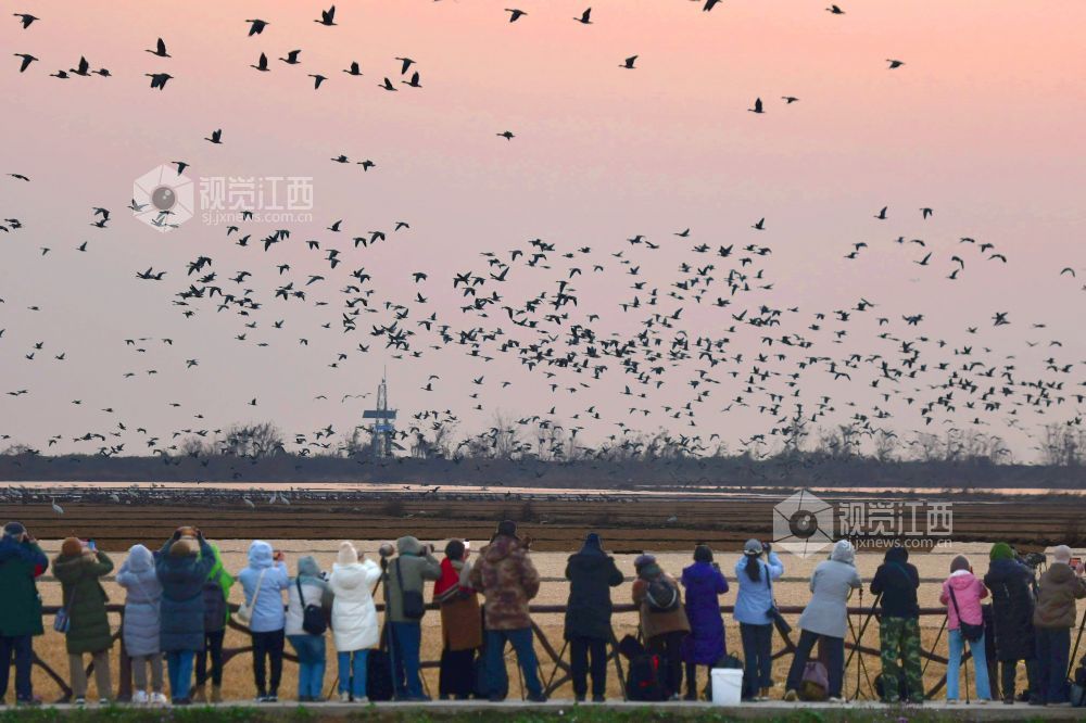 2025年12月26日,江西上饶余干县白鹤洲湿地热闹非凡,来自全国各地的摄影爱好者与游客齐聚于此,沉浸式观赏珍稀候鸟越冬盛景。