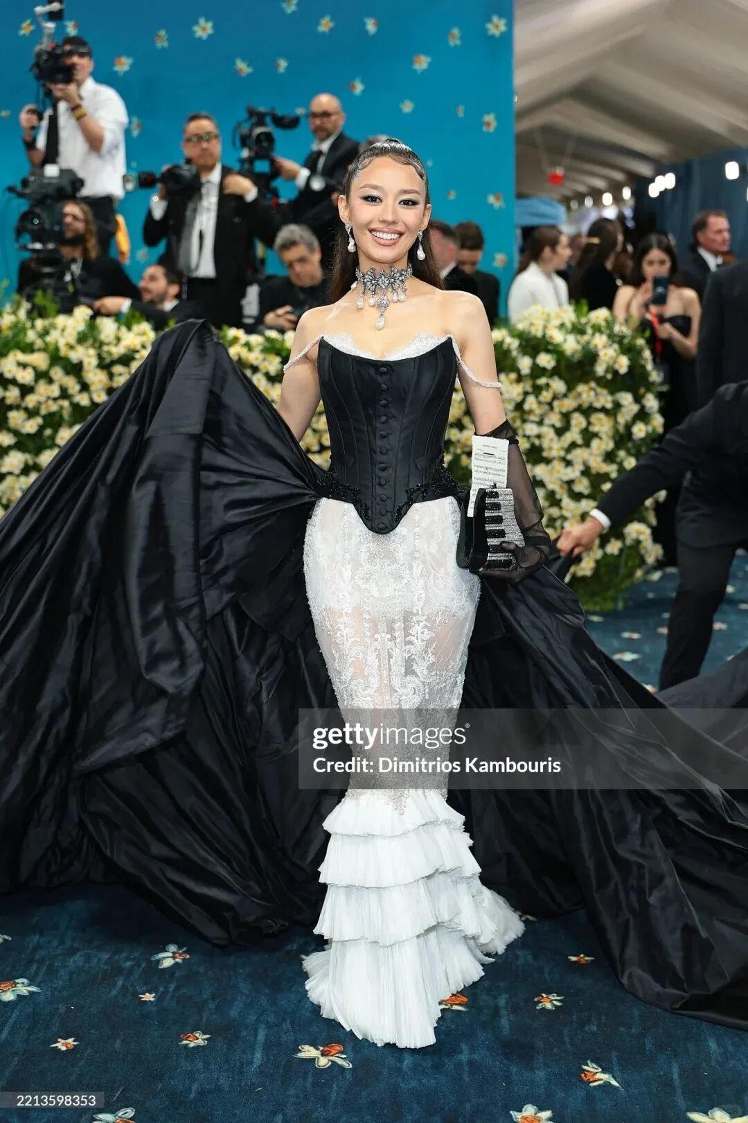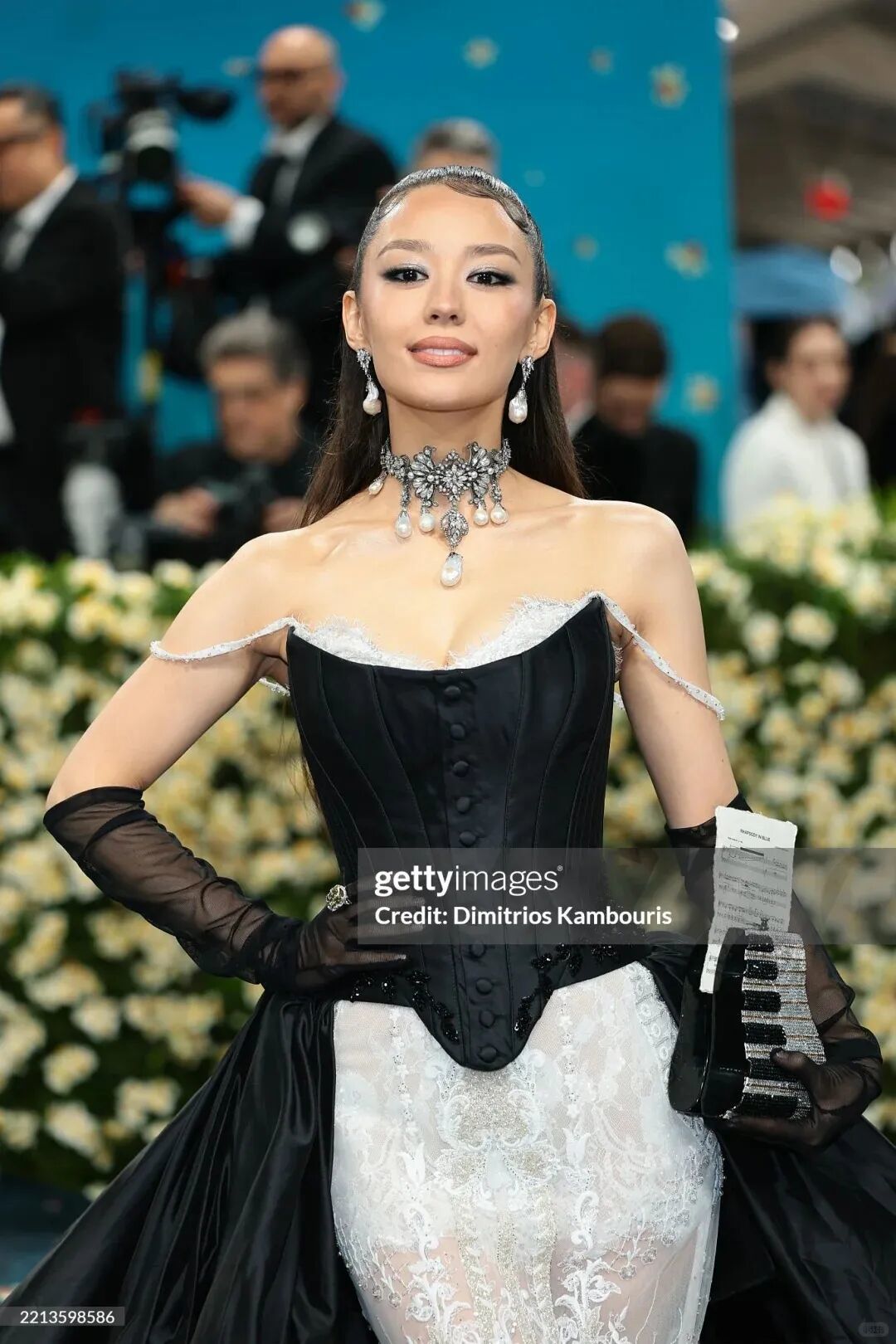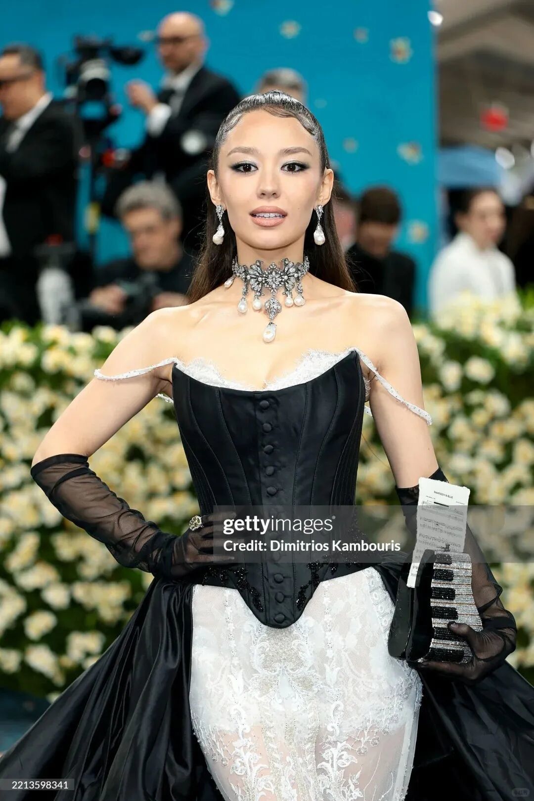 她上身Kim Kassas特别定制礼服,黑色胸衣拉高腰线,白色蕾丝鱼尾裙则完美勾勒身体曲线,搭配上存在感极强的珍珠饰品,又用钢琴键盘造型的手包突出了自己的钢琴家身份,整体造型足够抢眼,虽然元素堆叠过满,但也还算是不错的尝试。