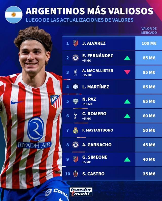 北京时间12月27日,德转列出了目前阿根廷身价最高的10名球员,胡利安-阿尔瓦雷斯以1亿欧元的身价高居第一,恩佐-费尔南德斯、麦卡利斯特以及劳塔罗同以8500万欧元并列第二。
