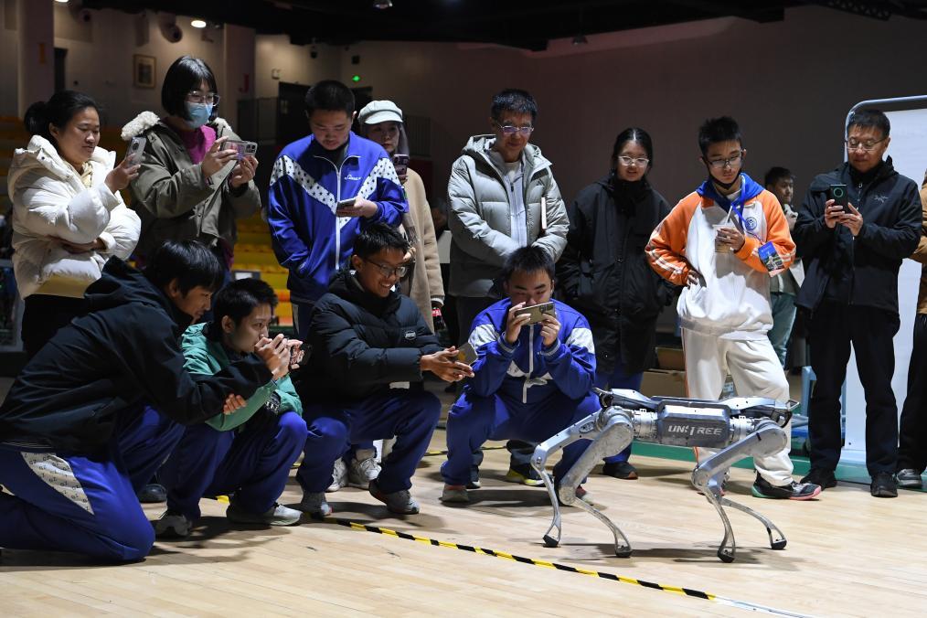11月15日,2025青少年具身智能与人形机器人科技教育研讨会暨后备科技人才培养交流会在北京举行。这是人们在现场观看一款仿生四足机器人展示。新华社记者 马宁 摄