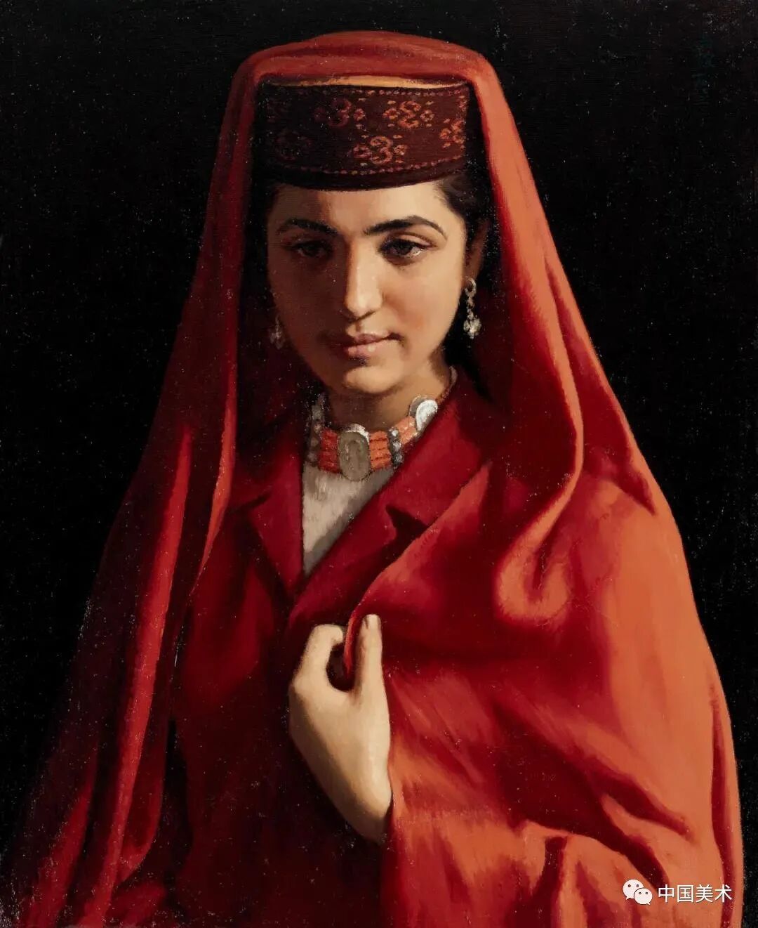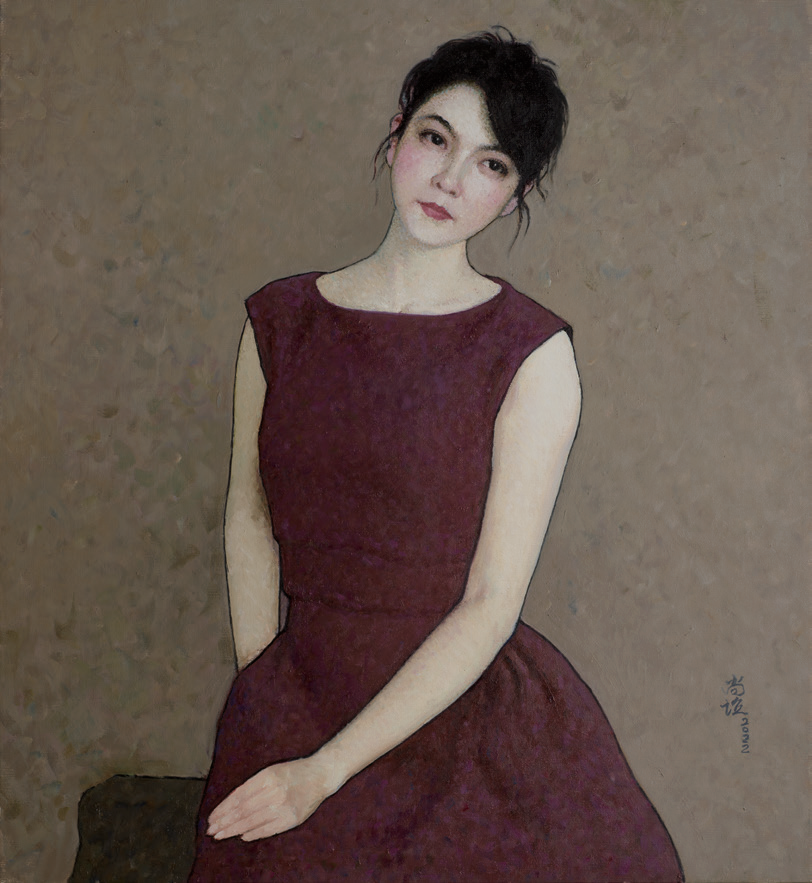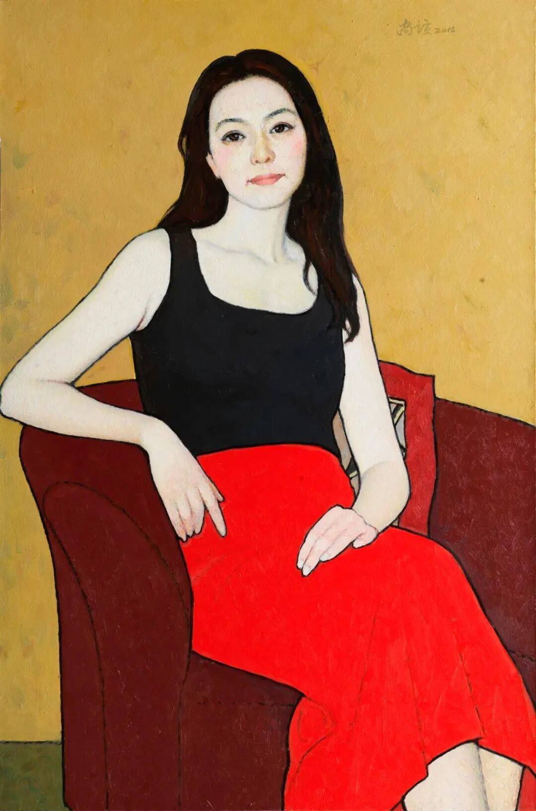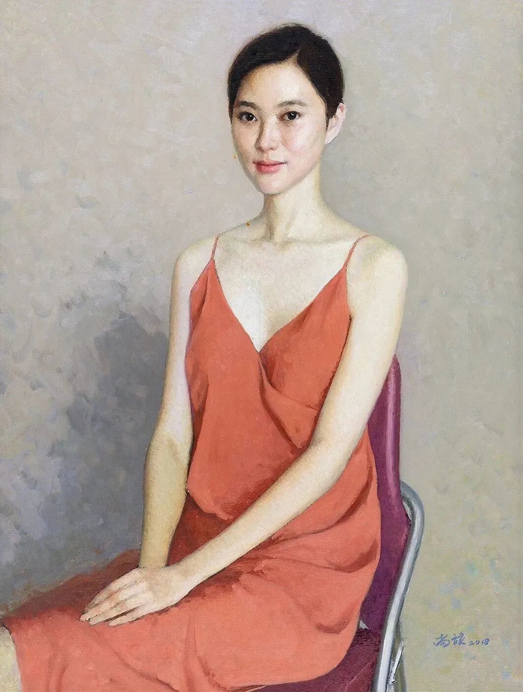 靳尚谊《穿红裙的祁艳》布面油画 90cm×82cm 2022年
