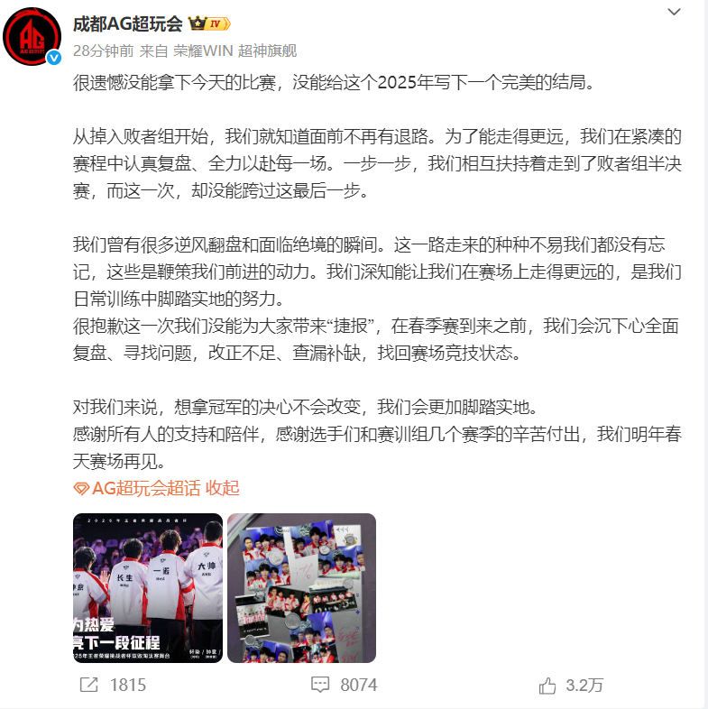 一诺所在的王者荣耀职业战队成都AG超玩会发布长文道歉,回应不敌Hero: