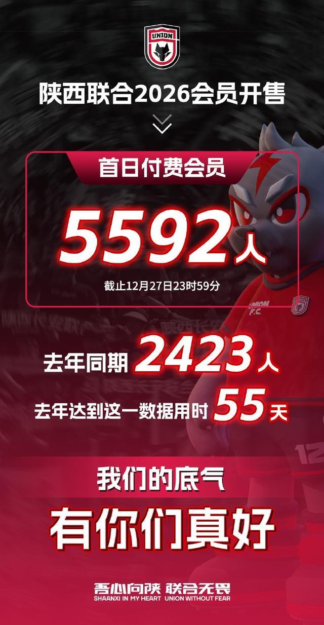 去年同期的这个数据是2423人,而且去年达到5592人足足用了55天。陕西联合官方发布了2026年会员售卖首日数据,并写道:“我们的底气!有你们真好!”