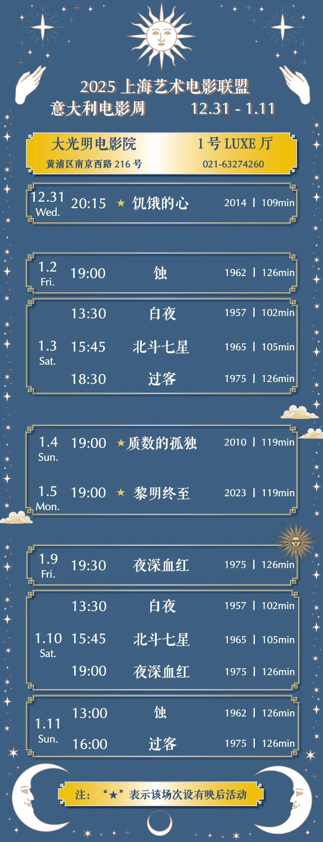 2025年末上海日常影展的压轴大展、同时也是2026年开年大展的“新年意影”意大利电影周已开票,打开淘票票app或猫眼电影app,找到大光明电影院,即可购票