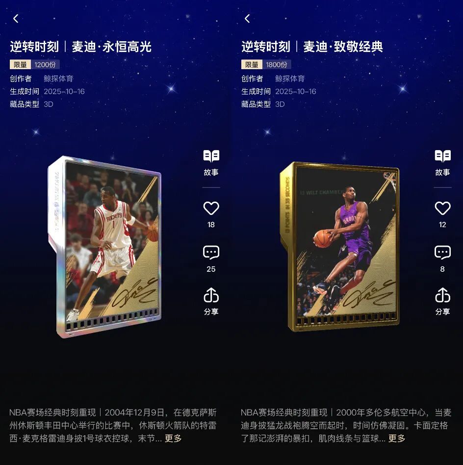 这种战略选择在国际市场同样得到了验证。今年10月,联手NBA及13IN35品牌主理人麦迪,鲸探以「人生逆转」为核心,推出「逆转时刻·麦迪亲签典藏卡」盲盒。首次将体育赛事与数字资产、线下权益相结合,全网曝光超1亿,成为体育IP数字化运营的范例。