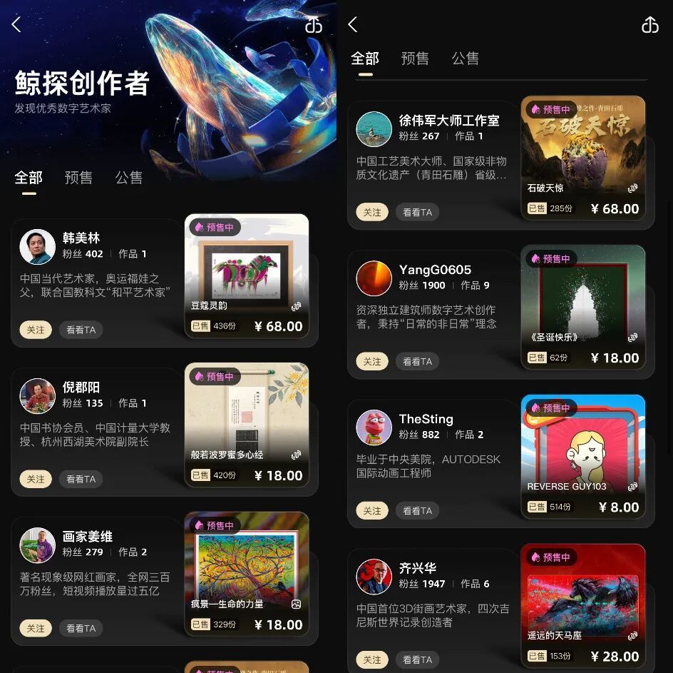 据了解,2025年鲸探上线“数字艺术展”,向个人创作者全面开放。
