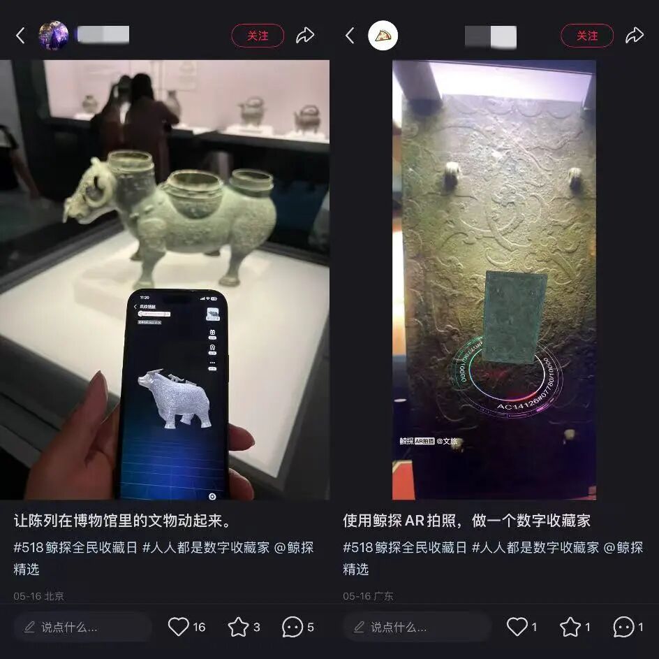 小红书上,许多用户谈论着“用鲸探AR拍照”后,身临其境地“走进”文物背后的历史时空,“让陈列在博物馆的文物动起来”。