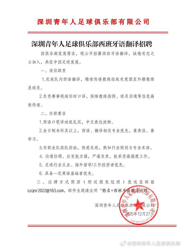 北京时间12月28日,深圳青年人官方发布公告,公开招募西班牙语翻译,此前他们官宣了西班牙籍主教练拉米罗。