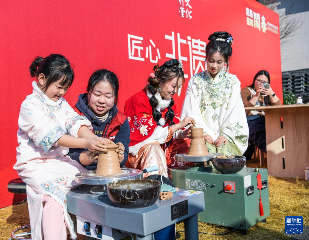 12月28日,人们在民俗游园会现场体验传统青瓷制作。