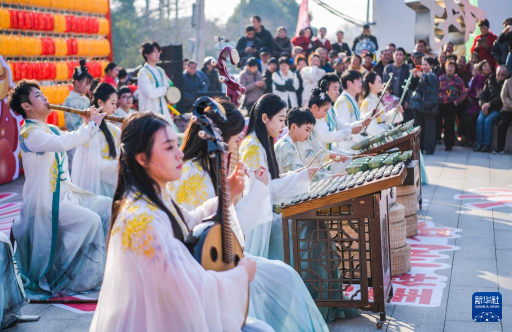 12月28日,人们在民俗游园会现场观看乐器表演。