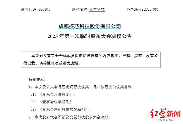 12月26日,振芯科技公告2025年第一次临时股东大会决议结果,共有三项议案被否,控股股东国腾电子投出关键反对票。