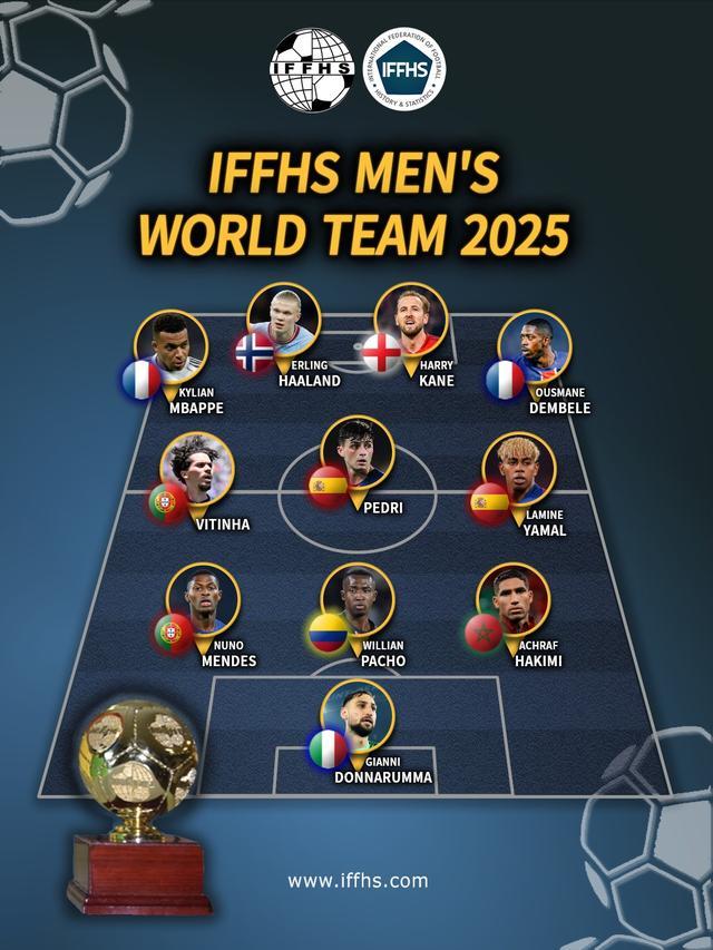 IFFHS(国际足球历史和统计联合会)公布了该机构评选的2025年度世界足坛男足最佳阵容,哈兰德、姆巴佩、凯恩、登贝莱、亚马尔等人在列。