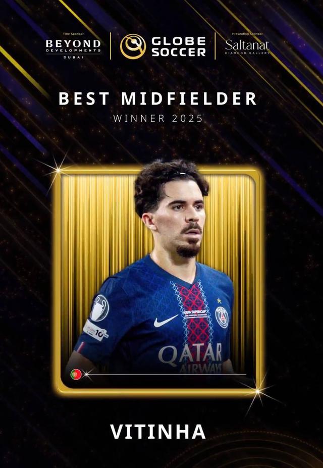 根据环球足球奖公布的结果,维蒂尼亚获得了2025年度环球足球奖。2025年,维蒂尼亚帮助巴黎赢得了欧冠冠军、洲际杯冠军、欧超杯冠军、法甲冠军、法国杯冠军和法国超级杯冠军,同时也帮助葡萄牙队赢得了欧国联冠军,并且晋级世界杯决赛圈,而他是巴黎和葡萄牙阵中不可或缺的一部分。