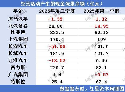 财报数据显示,2025年第三季度,海马汽车、北汽蓝谷和广汽集团的经营活动产生的现金流量净额为负数。