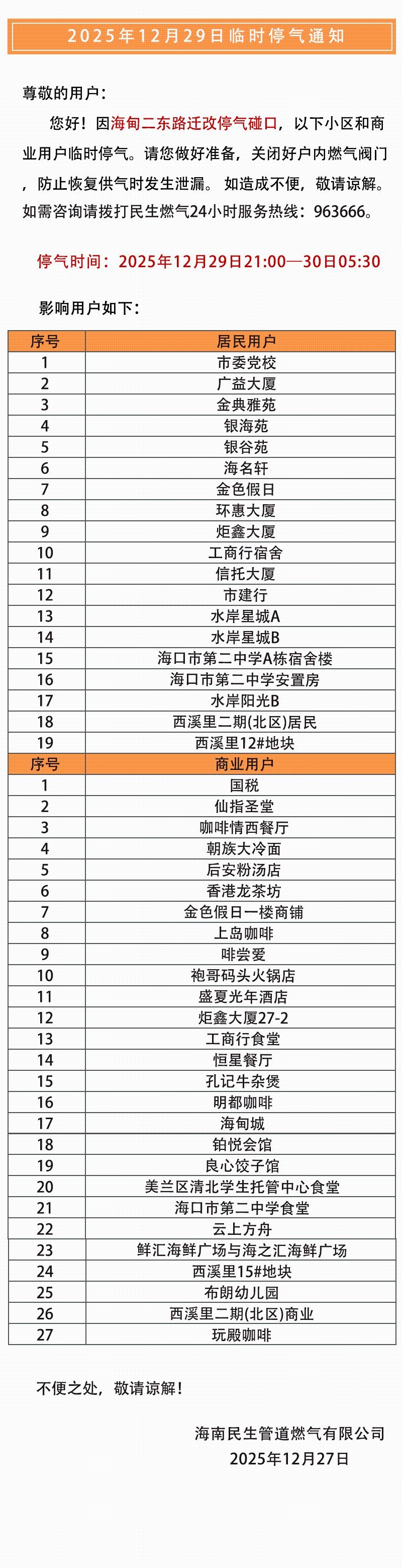 据海南民生管道燃气有限公司消息,2025年12月29日21:00—30日05:30,因海甸二东路迁改停气碰口,以下小区和商业用户将临时停气。