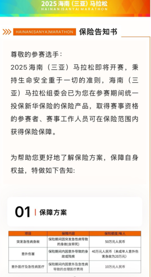 新华保险为此次海南三亚马拉松保障,覆盖马拉松、半程马拉松等全部组别选手及赛事工作人员。一旦发生意外伤害或突发状况,公司将启动快速理赔响应机制。