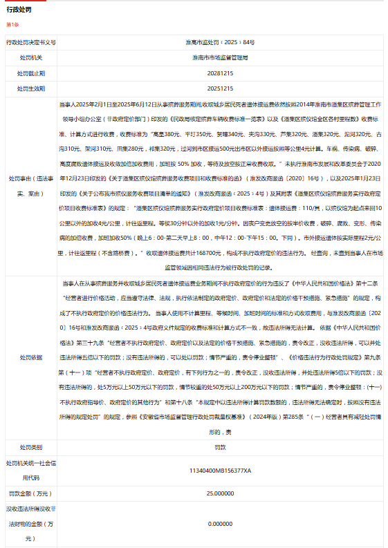 公开处罚信息显示,处罚事由是:当事人2025年2月1日至2025年6月12日从事殡葬服务期间,收取城乡居民死者遗体接运费依然按照2014年淮南市潘集区殡葬管理工作领导小组办公室(非政府定价部门)印发的《民政局核定殡葬车辆收费标准一览表》以及《潘集区殡仪馆全区各村里程数》收费标准、计算方式进行收费,收费标准为“高皇380元、平圩350元、贺疃340元、夹沟330元、芦集320元、潘集320元、泥河320元、古沟310元、架河310元、田集280元,祁集320元,过河到市区接运500元出市区以外接运按照等公里4元计算。车祸、传染病、破碎、高度腐败遗体接运及收敛加倍加收费用,加班按 50% 加收,等待及放空按正常收费收取。”未执行淮南市发展和改革委员会于2020年12月23日印发的《关于潘集区殡仪馆殡葬服务收费项目和收费标准的函》(淮发改商服函〔2020〕16号),以及2025年1月23日印发的《关于公布我市殡仪服务收费项目清单的通知》(淮发改商服函﹝2025﹞4号)及其附表《潘集区殡仪馆殡葬服务实行政府定价项目收费标准表》的规定:“潘集区殡仪馆殡葬服务实行政府定价项目收费标准表:遗体接运费:110/具,以殡仪馆为起点来回10公里以外的加收4元/公里,计往返里程。等侯30分钟以外的加收1元/分钟。因丧户变更放空的按半价收费,破碎、腐败、变形、传染病的加倍收费,加班加收50%(晚上6:00-第二天早上8:00,中午12:00-下午15:00。下同)。市外接运遗体按实际里程2元/公里,计往返里程(不含路桥费)。”收取遗体接运费共计168700元,构成不执行政府定价的违法行为。 经查询,未查到当事人在市场监管领域因相同违法行为被行政处罚的记录。