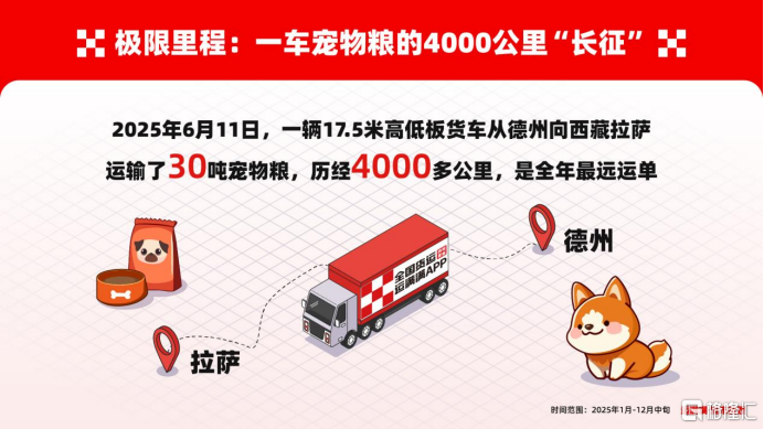 在整体稳定的运输结构之外,宠物粮的运输半径仍在持续拉长。数观显示,在运满满平台上,2025年最远一单宠物粮运输发生在6月11日:一辆 17.5 米高低板货车从山东德州出发,驶向西藏拉萨,运输了30吨宠物粮,全程约4000 公里。