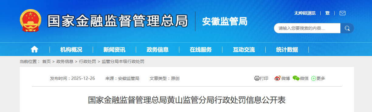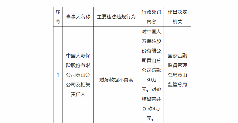 近日,据“国家金融监督管理总局安徽监管局”公开披露行政处罚信息,因财务数据不真实,国家金融监督管理总局黄山监管分局对中国人寿保险股份有限公司黄山分公司罚款30万元,对相关责任人姚炜警告并罚款4万元。