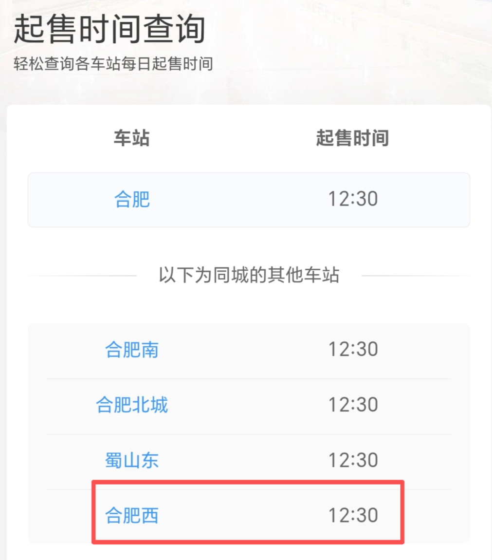 线上购票需通过铁路12306官网、12306APP等官方渠道,购票时请务必确认车站标注为“合肥西”,避免误选“合肥”“合肥南”站耽误行程。