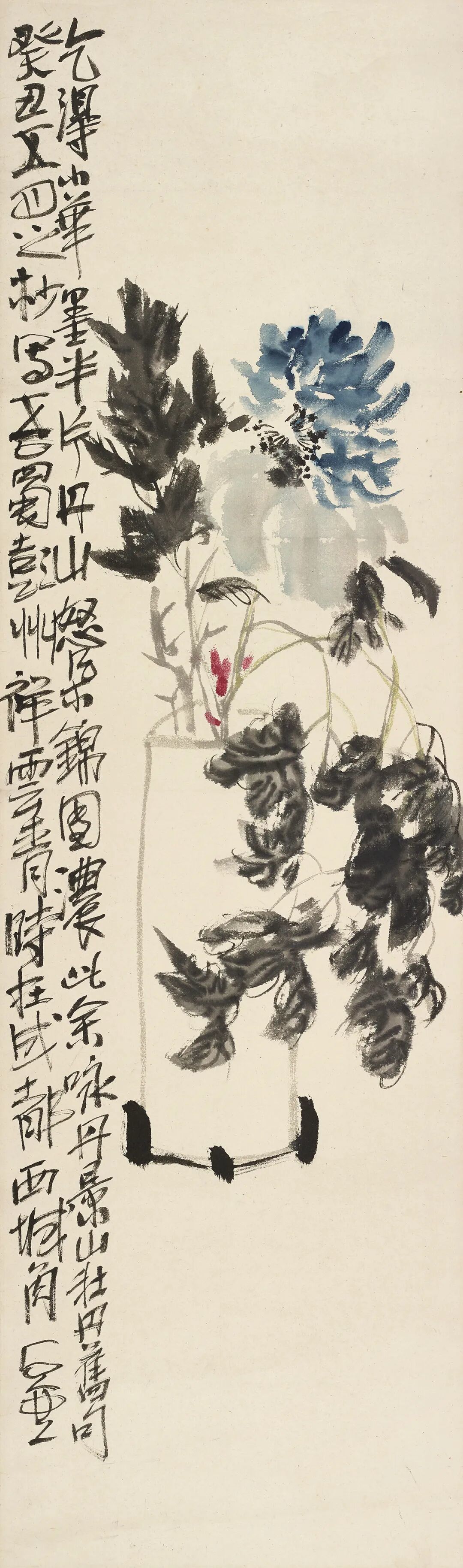 中国画的构图,均不出横、直、斜之变化,但需要文学艺术创作的能力去滋养,才能变化无穷。如吴昌硕画玉兰牡丹,玉兰开初春,而牡丹开季春,这是矛盾的统一,在构图造意上,玉兰取直取拙,而牡丹则取横取巧,而直与横、巧与拙同样是矛盾的统一。构图虽属技法,照应虚实、开合则是艺术手段,这就需要有高深的文学修养作为背景。否则,是不会产生独特的有创造性的作品的。