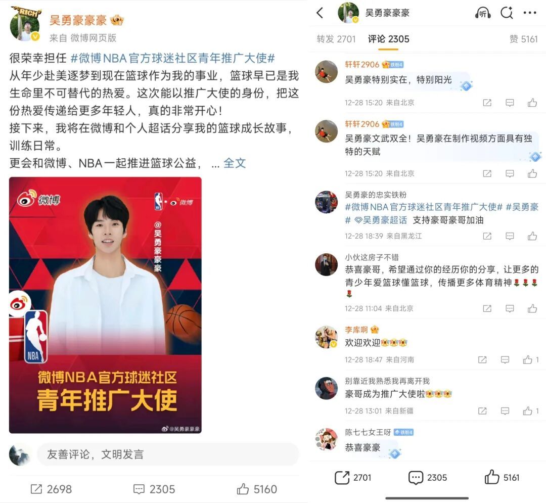 近日,@NBA 官宣@吴勇豪豪豪 正式成为#微博NBA官方球迷社区青年推广大使#。