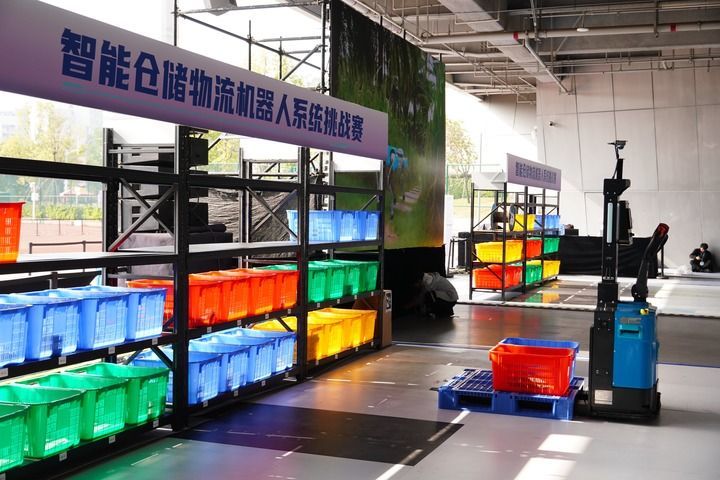 一台智能仓储物流机器人在比赛中挑战。新华每日电讯记者 周科 摄