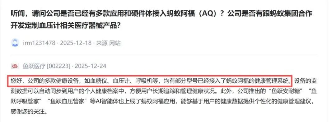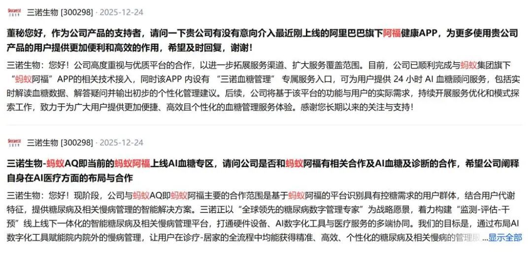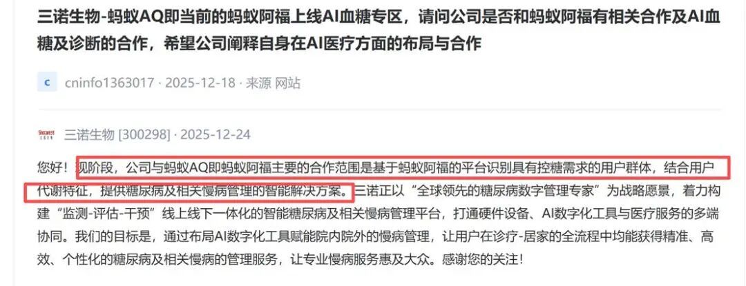 从当前的市场实践看,我们做了一些推演:阿福可以为医院、机构、药企这些B端机构提供技术服务,比如向医院开放大模型开发智能分诊系统,协助药企用药洞察,或者和智能硬件联手,做健康服务的深度定制。事实上,这类合作已有推进,例如三诺生物、鱼跃医疗等工地都在互动平台明确提及和阿福的合作: