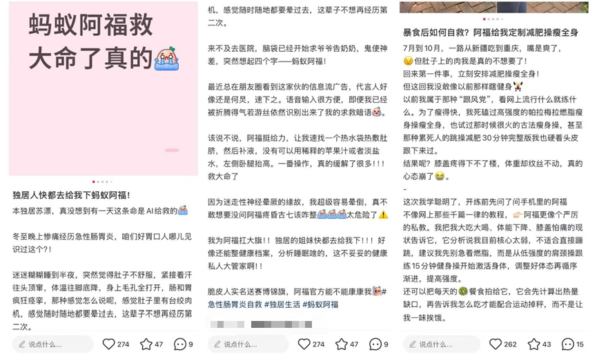 八妹发现,小红书上有很多人分享用阿福的经历。例如有独居女孩说自己有迷走神经性昏厥的毛病,深夜发作在阿福的帮助下自救脱险;也有人跟着阿福的定制方案,体重焦虑“自救”成功……